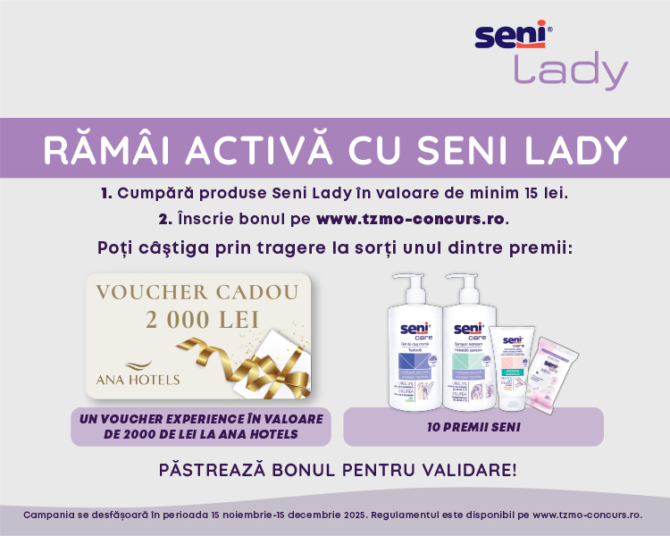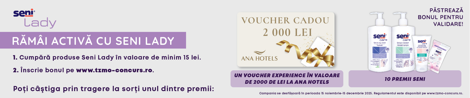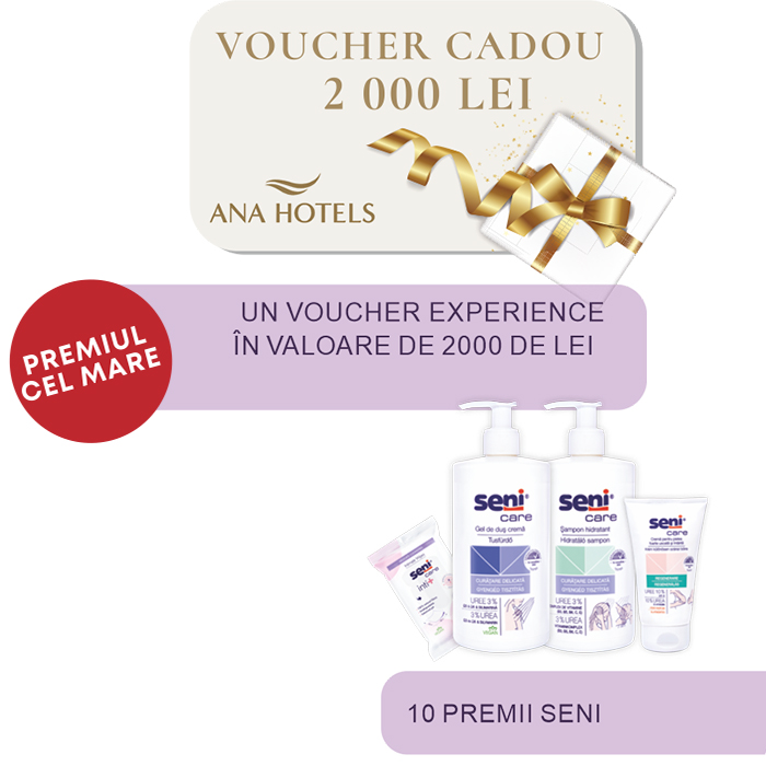 Cumpara produse Seni Lady in valoare de minimum 15 Lei, din orice magazin, orice marime si orice impachetare, inscrie bonul si poti castiga prin tragere la sorti unul dintre cele 10 premii Seni sau marele premiu, un Voucher Cadou EXPERIENCE – Ana Hotels in valoare de 2.000 Lei.